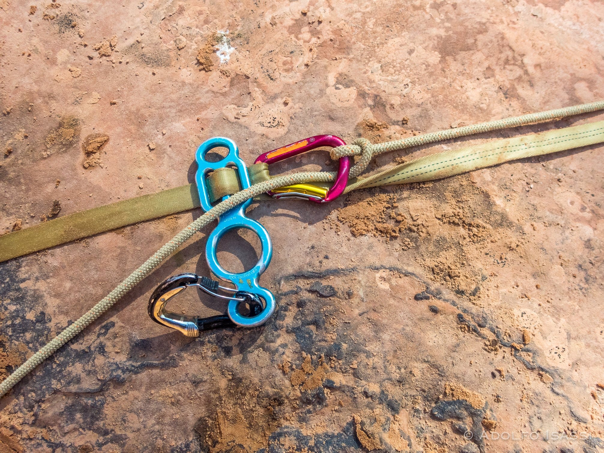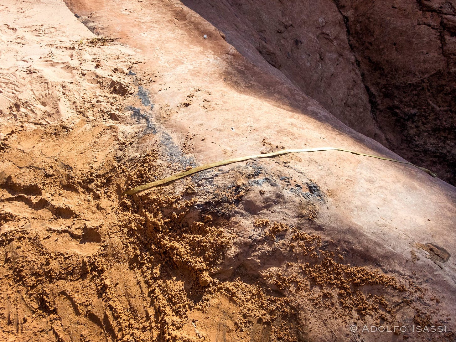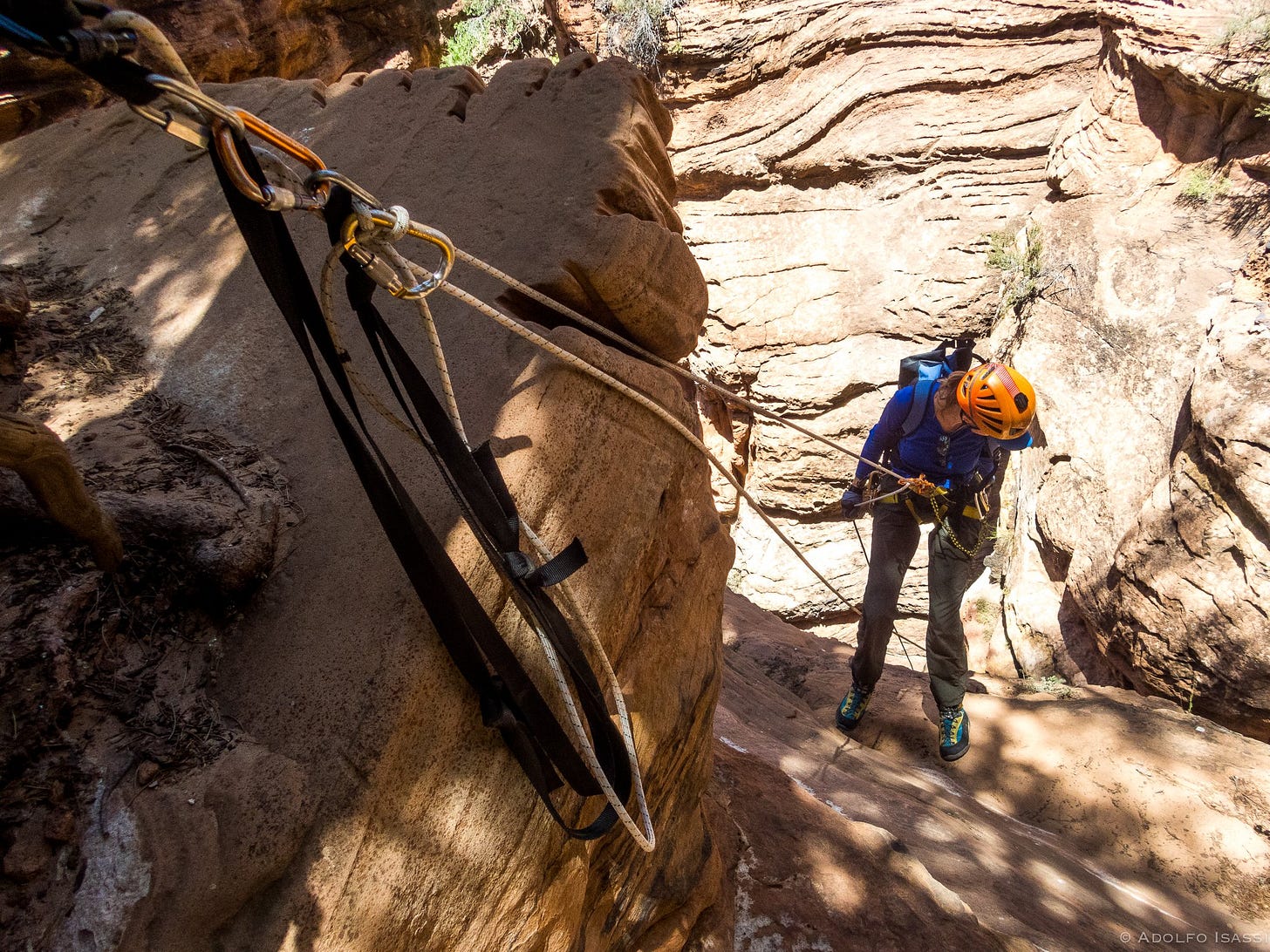 Spry Canyon in Zion NP. The poster child of the result of American Southwest wrongheaded anchoring practices. In the photo, you can see the Courtesy rigging in Courtesy Mode . Last person unhooks the orange HMS carabiner, and lets the master point get past all those rope grooves.