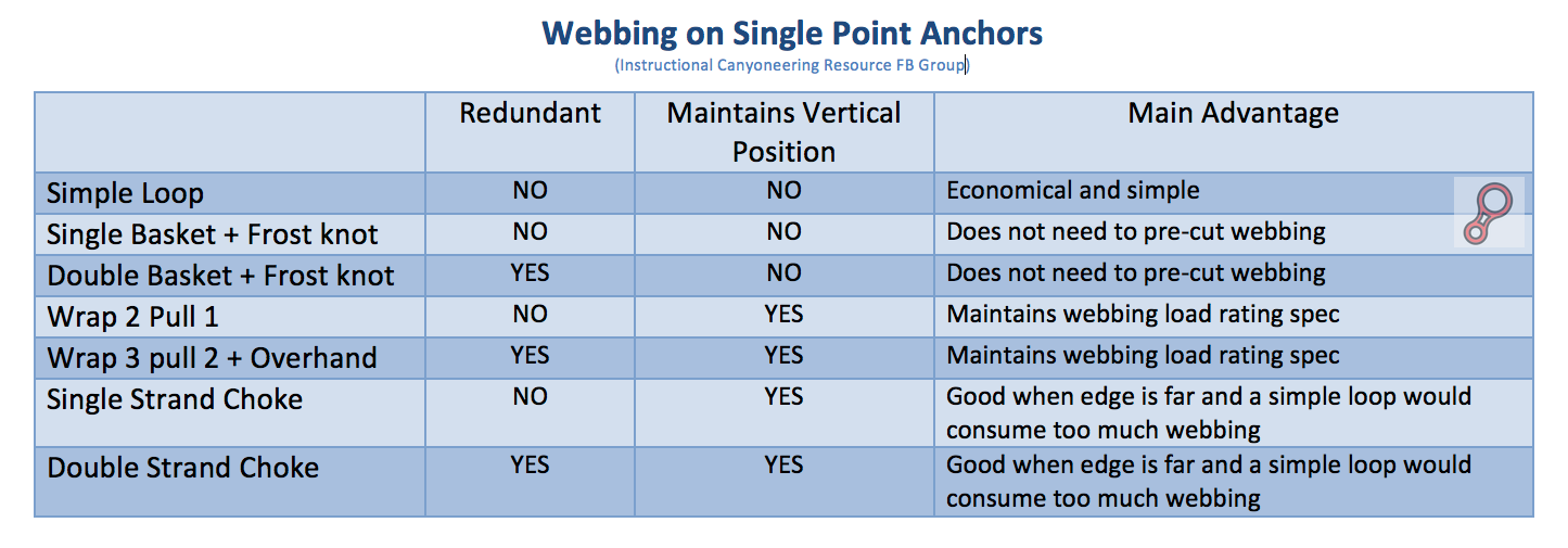 Here is a quick basic guide of choices to rig webbing around one point anchors. This table is meant to help beginners (or ‘experienced’) canyoneers move from a go-to rigging because “is the one that sounds the safest” to make more sound and objective choices.