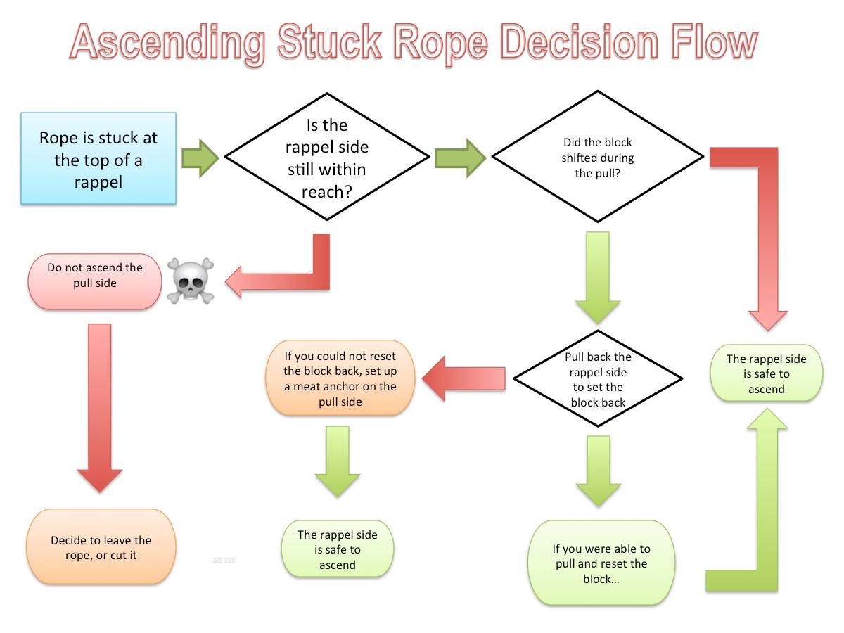 This a “Decision Flowchart” for ascending stuck ropes. At the core of this problem is making sure that the secure rope, the one it was used for rappelling, does not go out of reach. So, it is very important to test the recovery pull during the first five feet of the pull. If there is any indication of an incoming difficult pull....Stop, and consider ascending to fix the issue. This chart reflects the use of a SRT (Single Rope Technique) blocked system. Do not ascend Transient Rigging (ghosting) systems, or DRT out of reach systems.