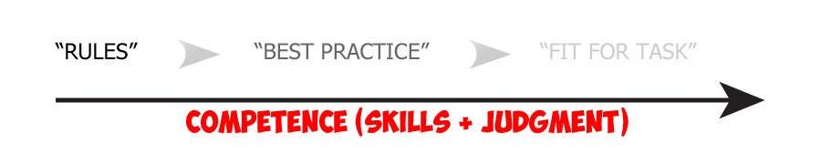 Rules vs Best Practice vs Fit for Task. When someone is still low on the competency continuum, it makes sense to start them out with some rules on how to do things. We should also impress upon them the wisdom of sticking to basic canyons as they master basic skills, then progress from there.
